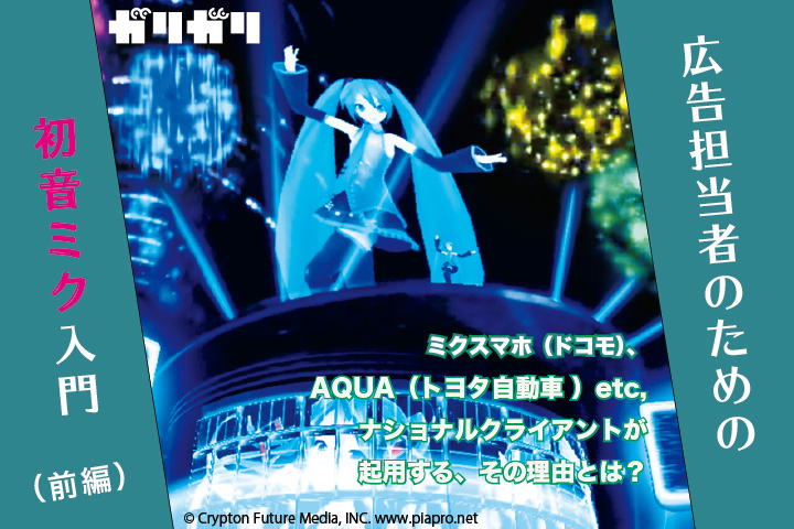 今年10月17〜18日、ニューヨークで初音ミク総合イベント「HATSUNE MIKU EXPO 2014」が開催された。ネット発の美少女キャラクター・初音ミクは、ゼロ年代終盤から10年代にかけ、多くのメディアにおいてその存在感を拡大。楽曲のCD化、ゲーム化、コミカライズ、ノベライズ、フィギュア化、二次創作へと版図を広げ、国内外で毎年のように何らかのイベントが開催されている。さらに10年代以降は企業とのコラボレーションも増えてきた。今回はそんな初音ミクを広告起用の観点から考察してみよう。